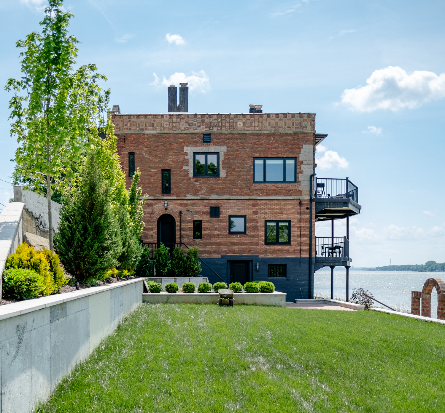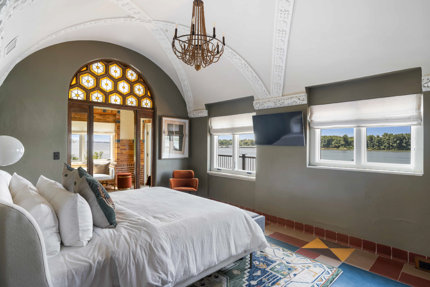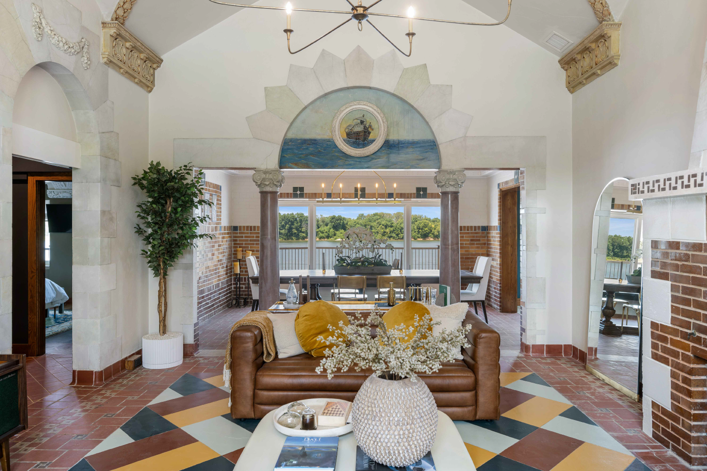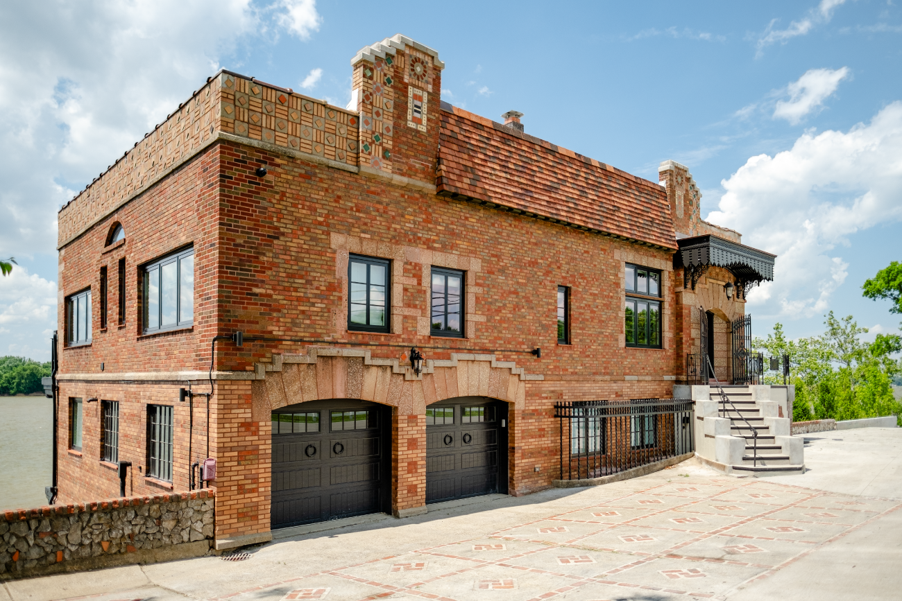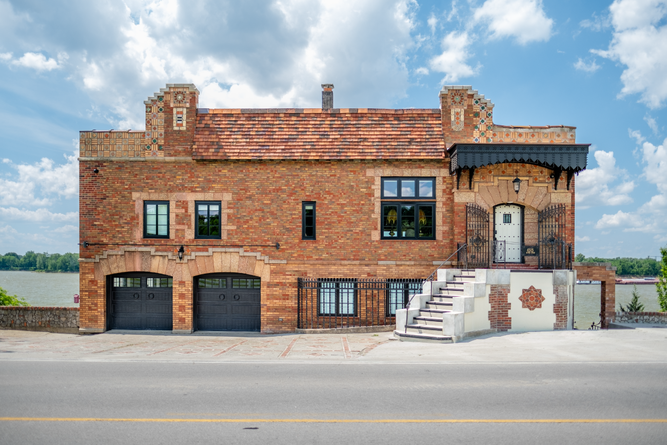 Situated on the Louisville riverfront, the Gaffney House is an eclectic 1927 residence combining Classical, Arts and Crafts, and Mayan architectural styles. The project required modernizing a property that had sat vacant for decades while addressing the complex flooding risks posed by the site’s fluctuating water levels. We collaborated with the Army Corps of Engineers to implement flood mitigation strategies that protect the structure without altering its historic character. The design restores original features such as the Mayan-motif concrete floors and stained glass while reactivating three stories of rear balconies. This rehabilitation secures the building’s legacy and reconnects the interior to panoramic views of the Ohio River and Six Mile Island.