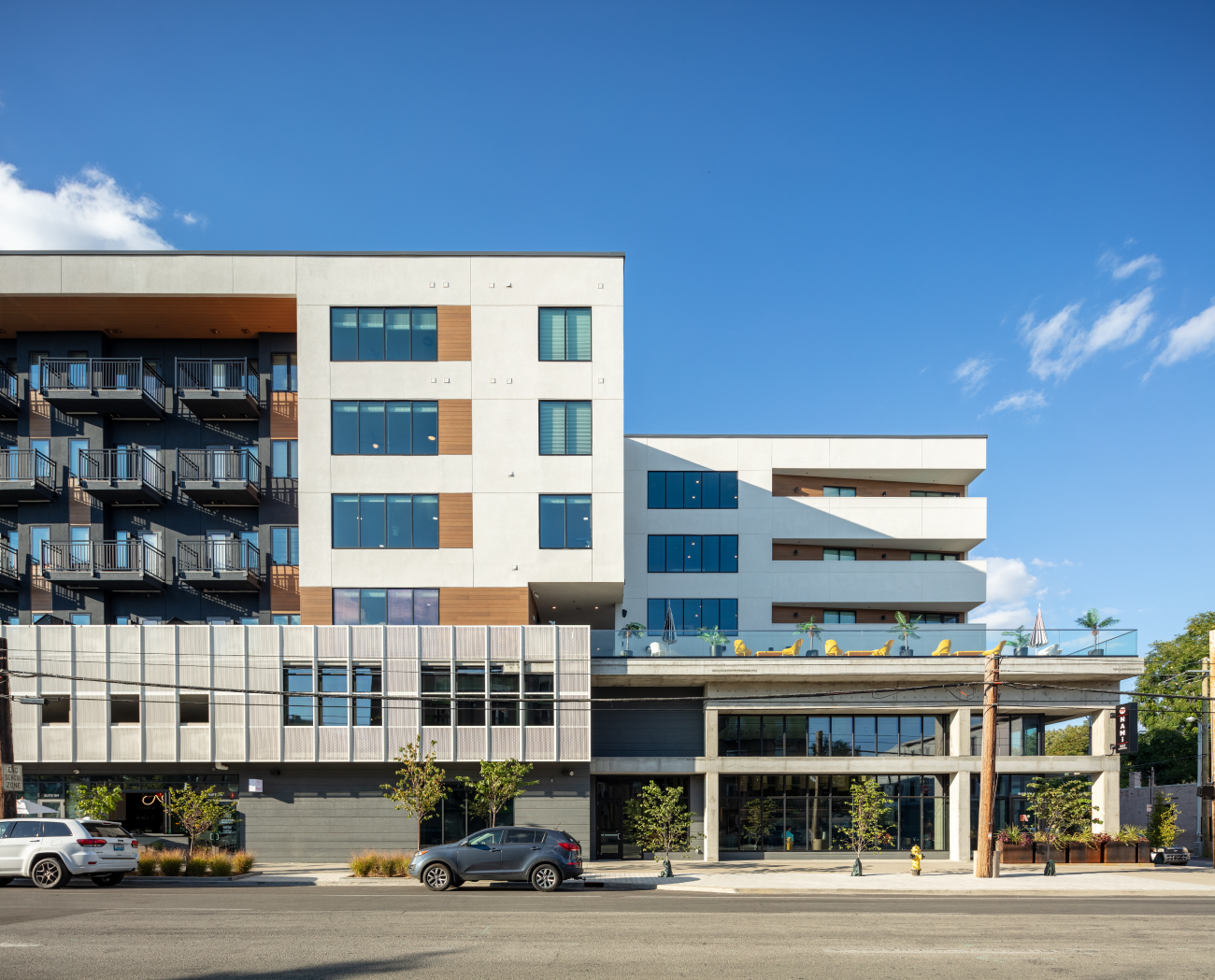 Martin on Main redevelops a site at 835 East Main Street in Louisville, Kentucky, into a 197,000-square-foot mixed-use destination. This six-story podium structure features 137 apartments stacked above a two-story concrete base containing parking and commercial space. Positioned between a dense commercial corridor and a historic single-family neighborhood, the design navigates complex zoning constraints to bridge these distinct urban scales. The building integrates a wealth of resident amenities including a third-floor swimming pool, coworking spaces, and a fitness center with a climbing wall. The ground floor activates the streetscape by housing Nami Korean Steakhouse, an award-winning restaurant by Chef Edward Lee.
