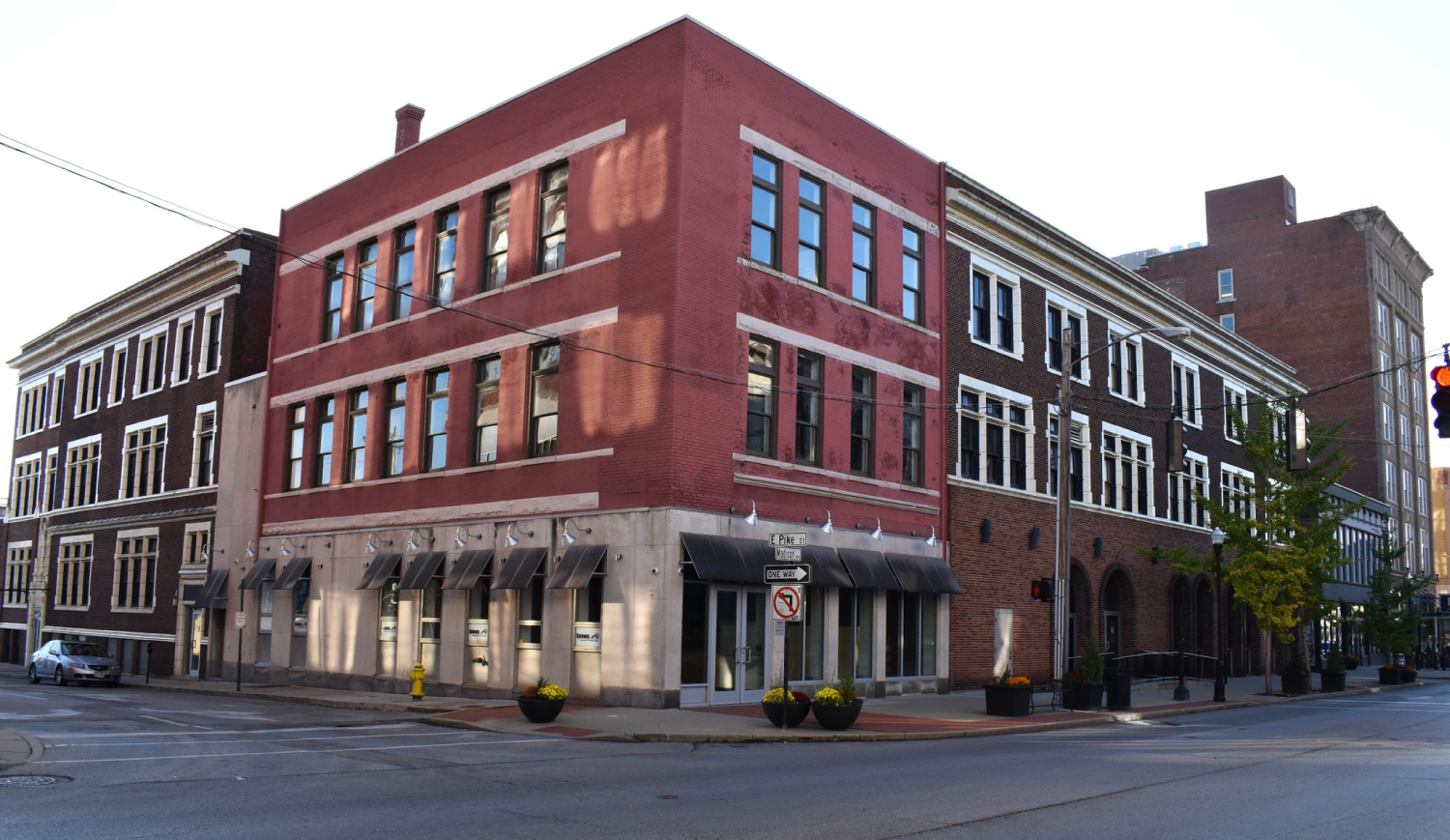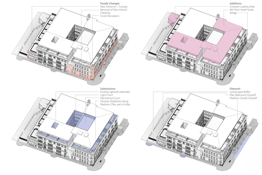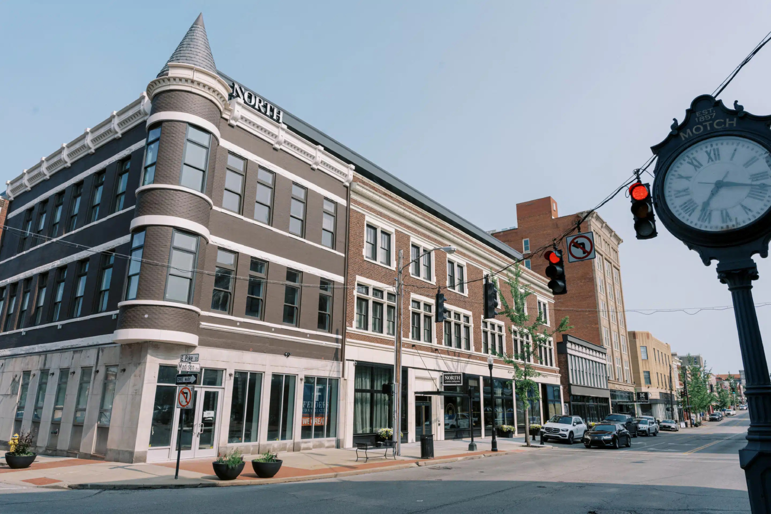 Located in Covington, Kentucky, this project combines an 1890 bank and a 1912 YMCA complex into a single 84,700-square-foot hospitality destination. The renovation adapts these historic structures into a new 53-key hotel with a 500-person ballroom situated in the basement. To ensure seamless guest movement, we connected the project to the existing adjacent hotel using a new basement tunnel and a second-floor pedestrian bridge. The design also repurposes a single-story addition to house laundry and receiving services while establishing a dedicated ballroom entrance along Pike Street. This transformation revitalizes the historic corner by integrating modern commercial spaces with essential hospitality functions.