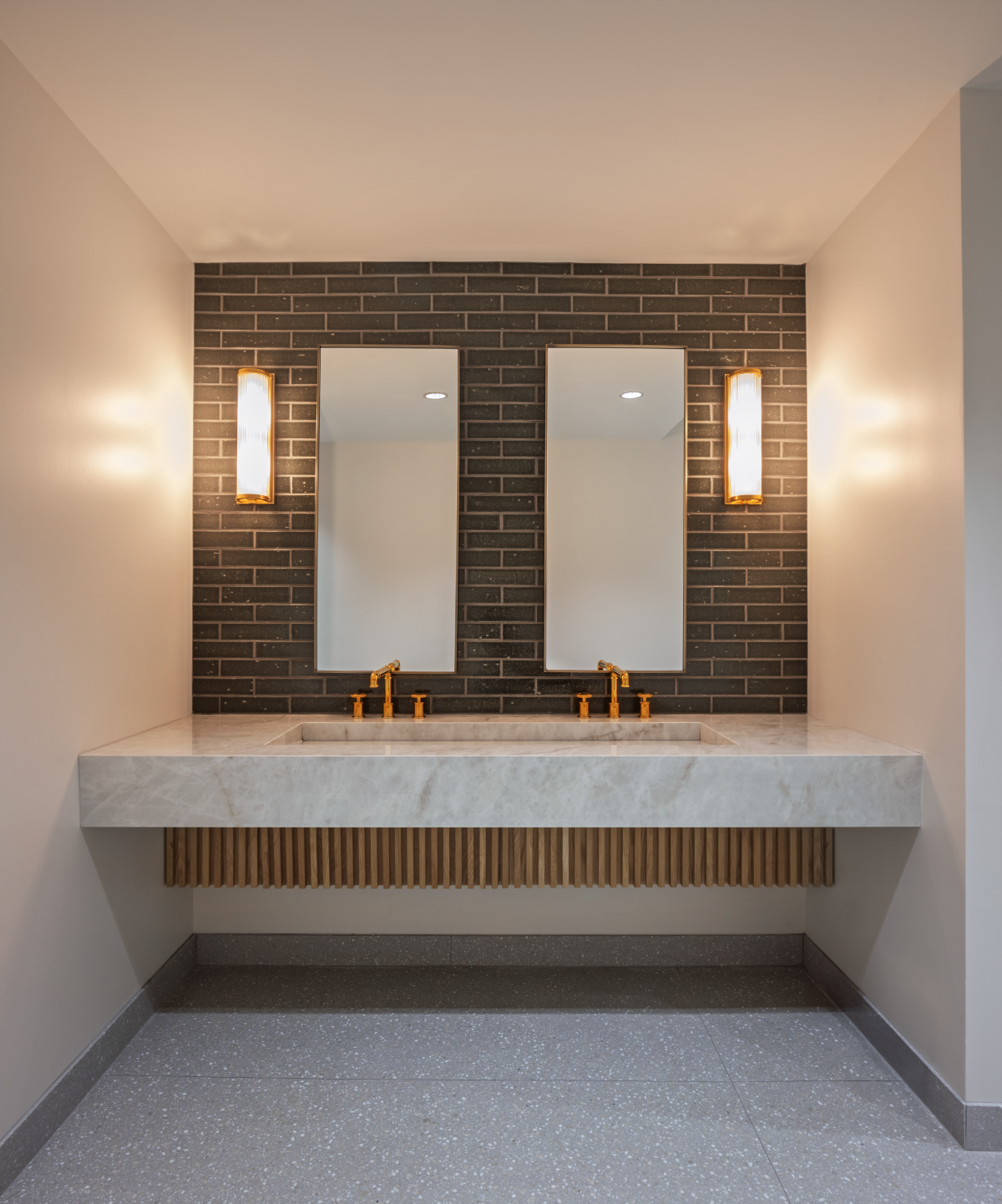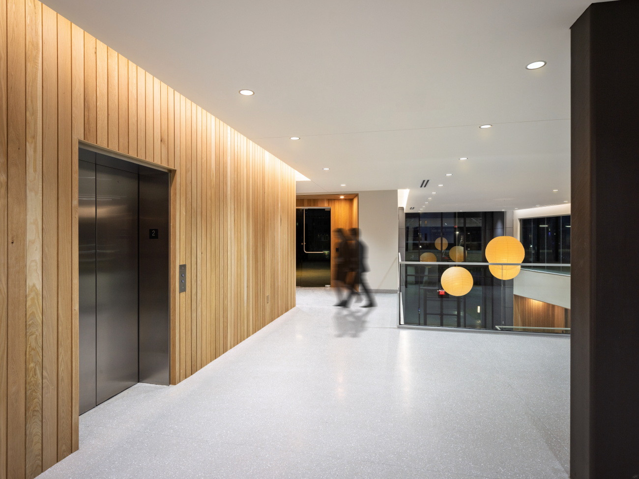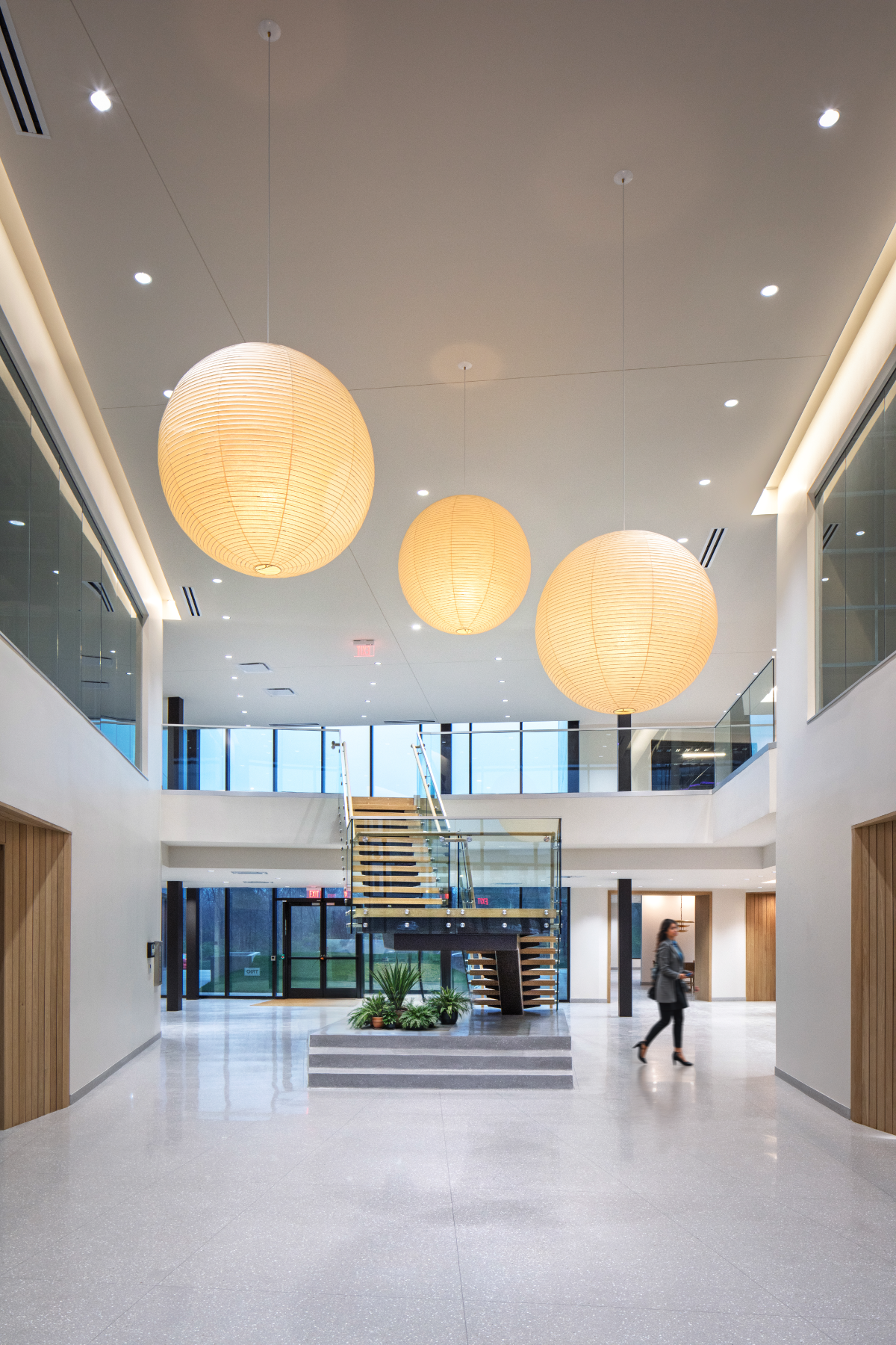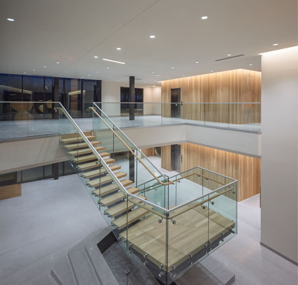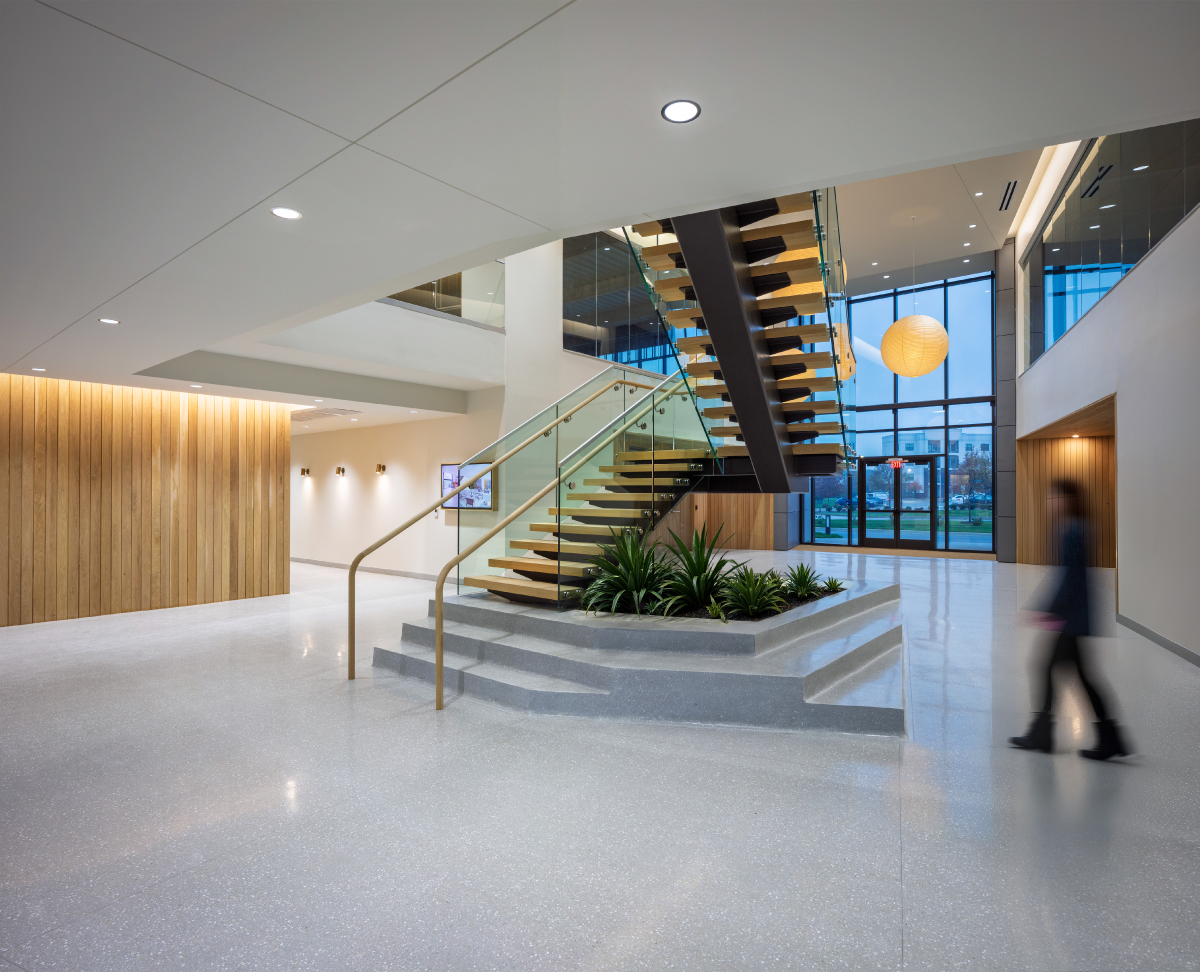 The interior design of The West prioritizes connectivity and equitable access to create a welcoming environment for a diverse range of occupants. A grand staircase anchors the open lobby area and serves as a central circulation spine that encourages movement through the public spaces. We balanced the private tenant suites with shared amenities including a furnished lounge, a bar, and a communal conference room. These gathering spots seamlessly flow into a rear outdoor courtyard to provide varied settings for small group interaction. By integrating inclusive safety features and flexible planning strategies, the design ensures the building remains adaptable while fostering a strong sense of community among tenants.